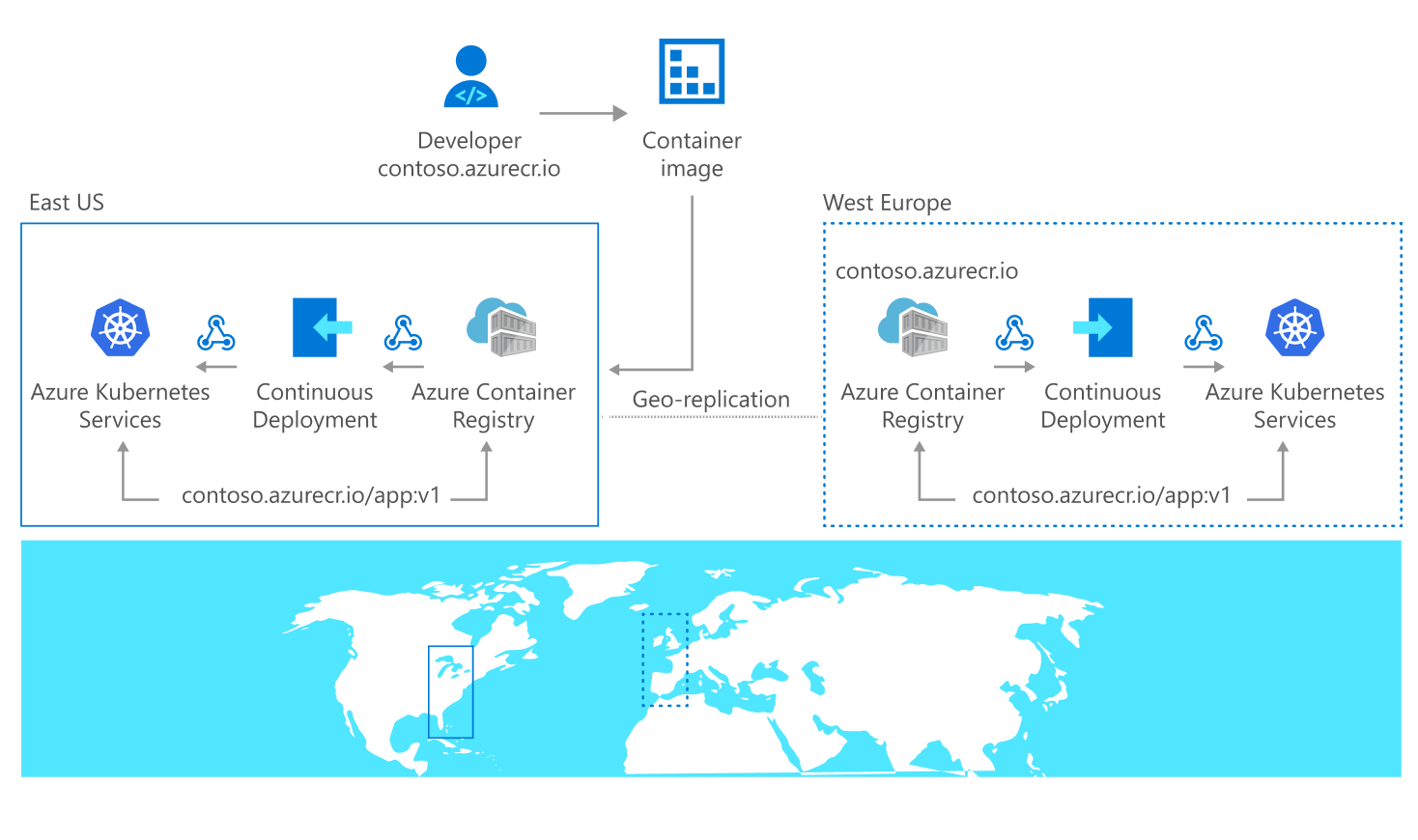 Get both the security of a private network and the robustness of a managed, geo-replicated service, using Azure Virtual Network integration and firewall rules. Restrict access to your registry to services deployed within a virtual network—for example, to an Azure Kubernetes Service instance.