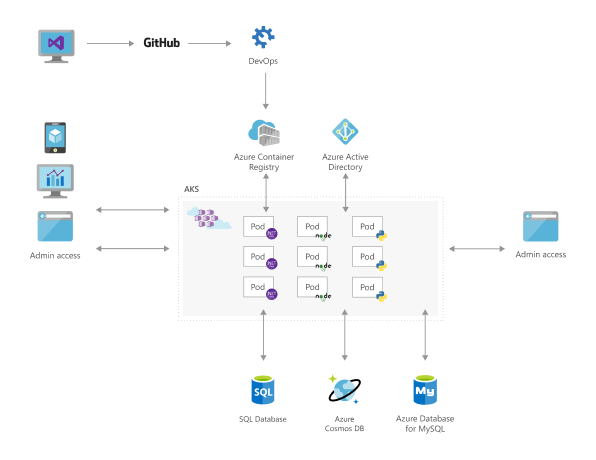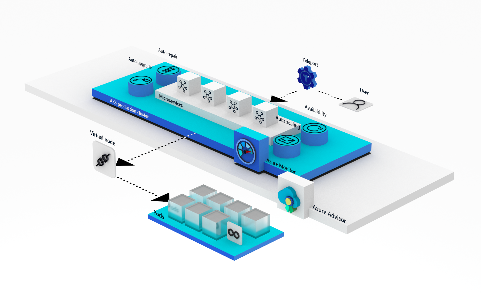 • Azure Kubernetes Service (AKS) offers the quickest way to start developing and deploying cloud-native apps in Azure, datacenters, or at the edge, with built-in code-to-cloud pipelines and guardrails. As a hosted Kubernetes service, Azure handles critical tasks, like health monitoring and maintenance. You only manage and maintain the agent nodes.
