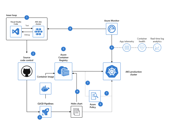 Iteratively develop and debug microservice applications with the Kubernetes extensions for Microsoft Visual Studio and Visual Studio Code. Add CI/CD pipelines through GitHub Actions and simplify runtime and portability with Dapr. Quickly set up a test deployment strategy and gain observability into your environment. Detect failures with the Kubernetes resource view, control-plane telemetry, log aggregation, and container health.