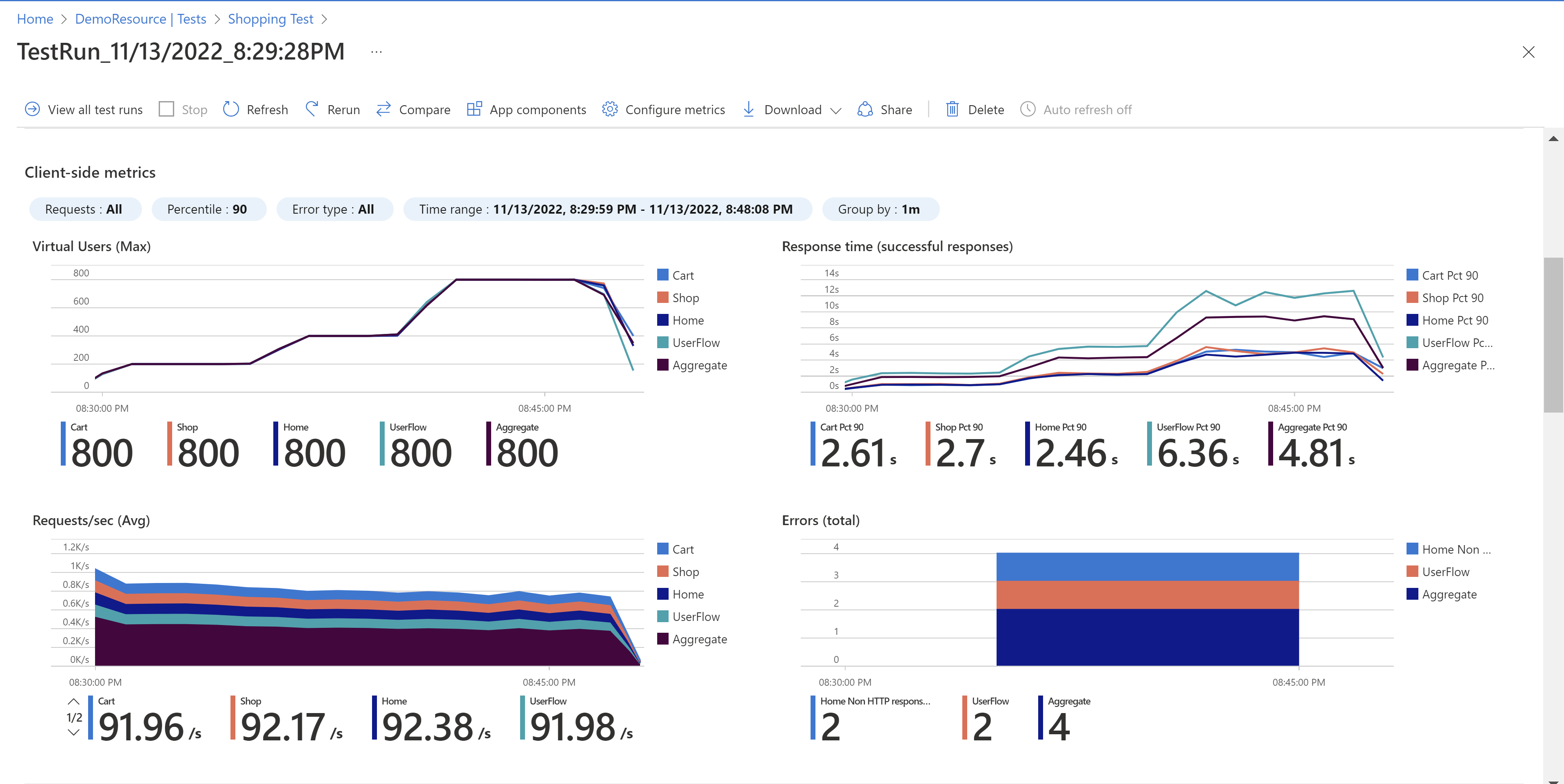 Optimize your app's scalability and capacity by observing how a high load affects its performance. Get deep, actionable insights and recommendations from a comprehensive view of curated client and server metrics to understand and improve app performance at scale—all on a single dashboard. Visually compare load tests to see the effect of application and environmental changes, along with how tests affect all parts of your app.