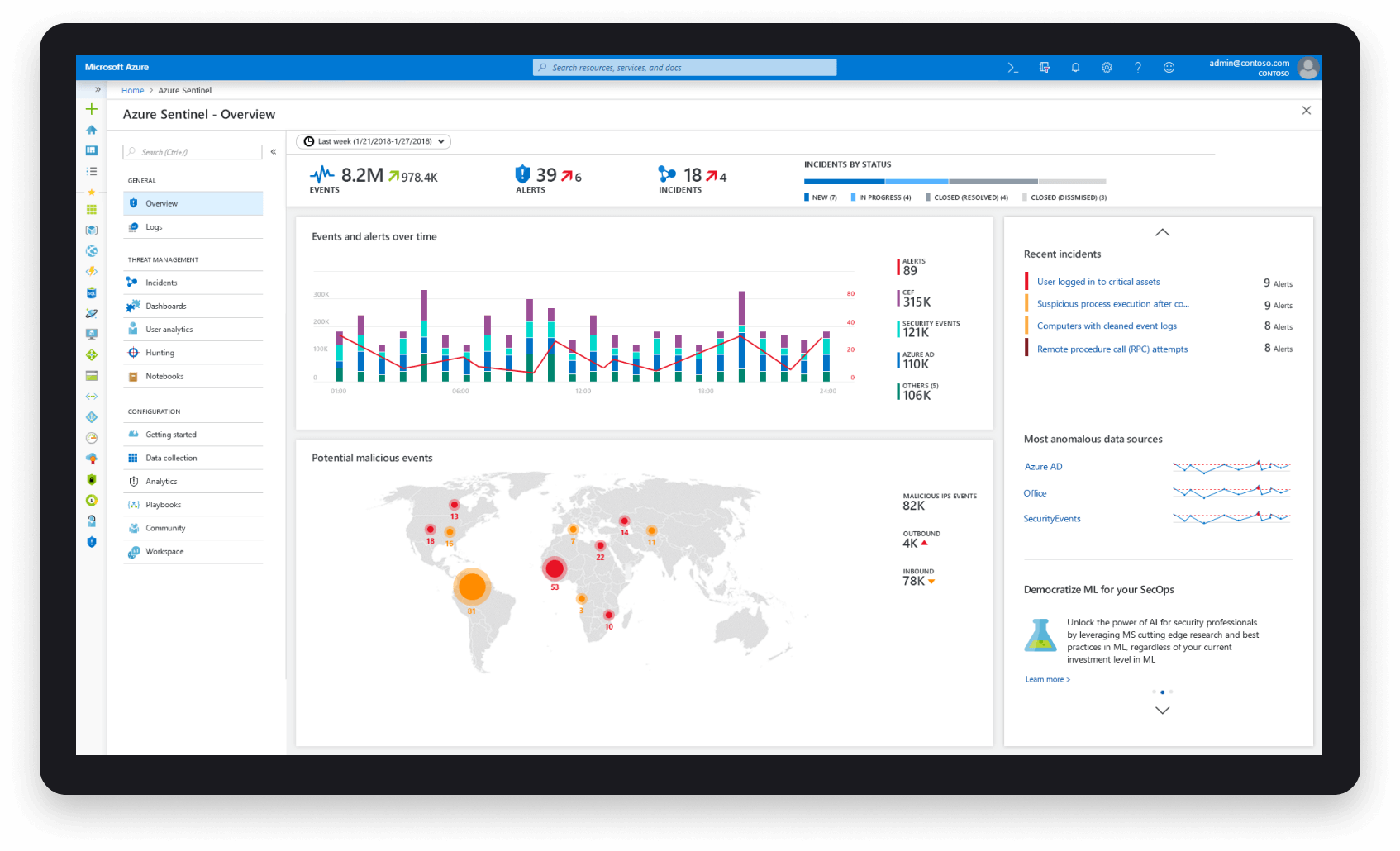 Simplify data collection across different sources, including Azure, on-premises solutions, and across clouds using built-in connectors. Connect with data from your Microsoft products in just a few clicks. Import Office 365 audit logs, Azure activity logs, and alerts from Microsoft threat protection solutions for free, and analyze and draw correlations to deepen your intelligence.