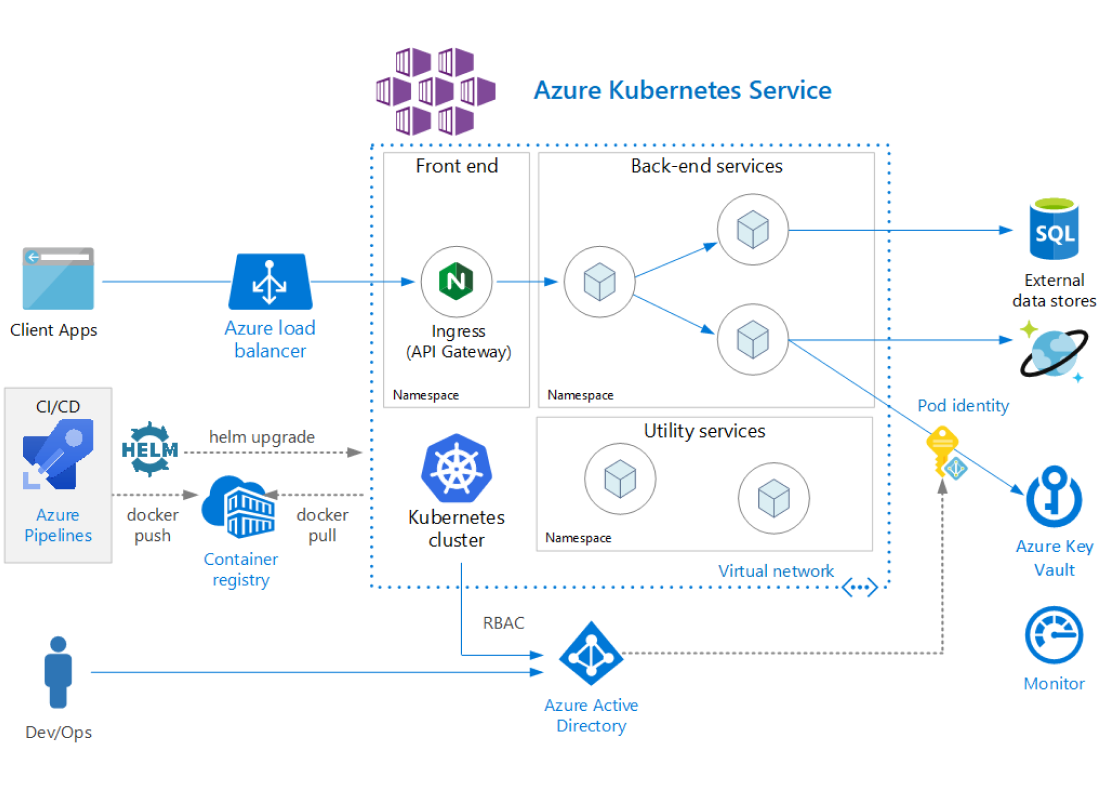 See a basic AKS configuration that can serve as a starting point for most microservices deployments. Plus, learn about the infrastructure and DevOps considerations of running a microservices architecture in AKS.