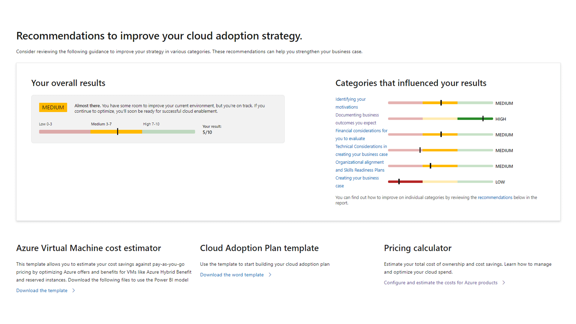 The Cloud Adoption Strategy Evaluator will provide you with a framework to understand different areas needed when building your cloud strategy and business case, and guide you to actionable next steps.