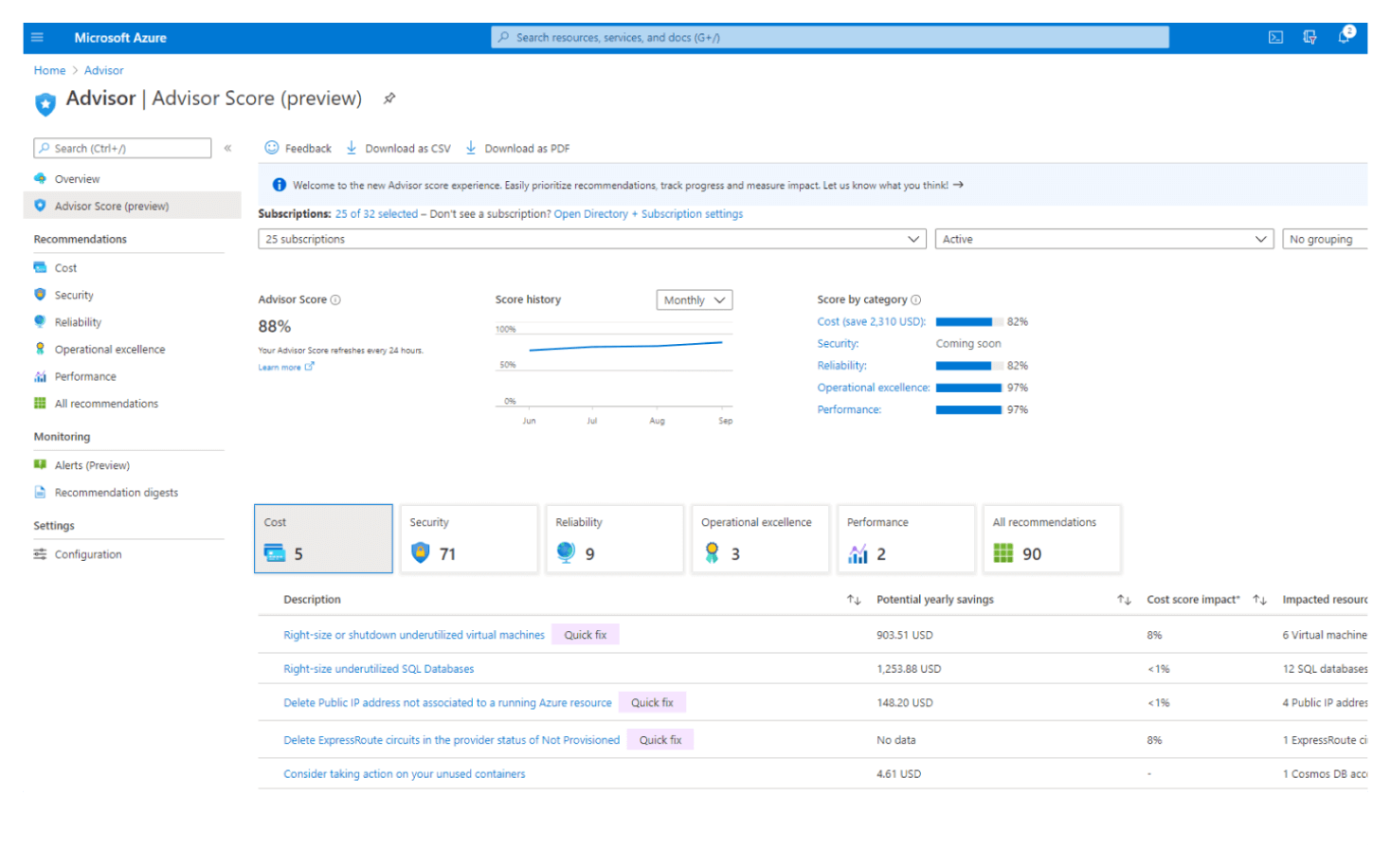 Prioritize recommendations from Azure Advisor using Azure Advisor Score. Assess how well you’re adopting Azure best practices, comparing and quantifying the impact of the Azure Advisor recommendations you’re already following with the ones you haven’t implemented yet. The gap analysis shows where to optimize your deployments by taking the most impactful actions first. Compare your evaluation with previous results to see changes over time, evaluate progress, and learn of new ways to optimize as they arise.