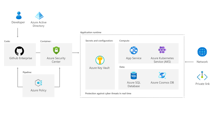 Modern applications require multilayered security across code, delivery pipelines, app runtimes, and databases. Start by providing developers secure dev boxes with well-governed identity. As part of the DevOps lifecycle, use automated tools to examine dependencies in code repositories and scan for vulnerabilities as you deploy apps to the target environment. Enterprise-grade secrets and policy management encrypt the applications and give the operations team centralized policy enforcement.