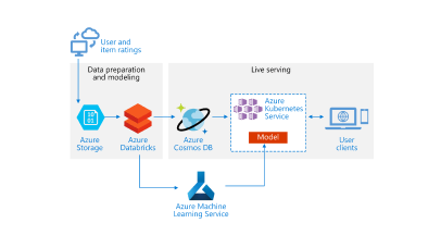 Train a recommendation model using Azure Databricks and deploy it as an API by using Azure Cosmos DB, Azure Machine Learning, and Azure Kubernetes Service (AKS).